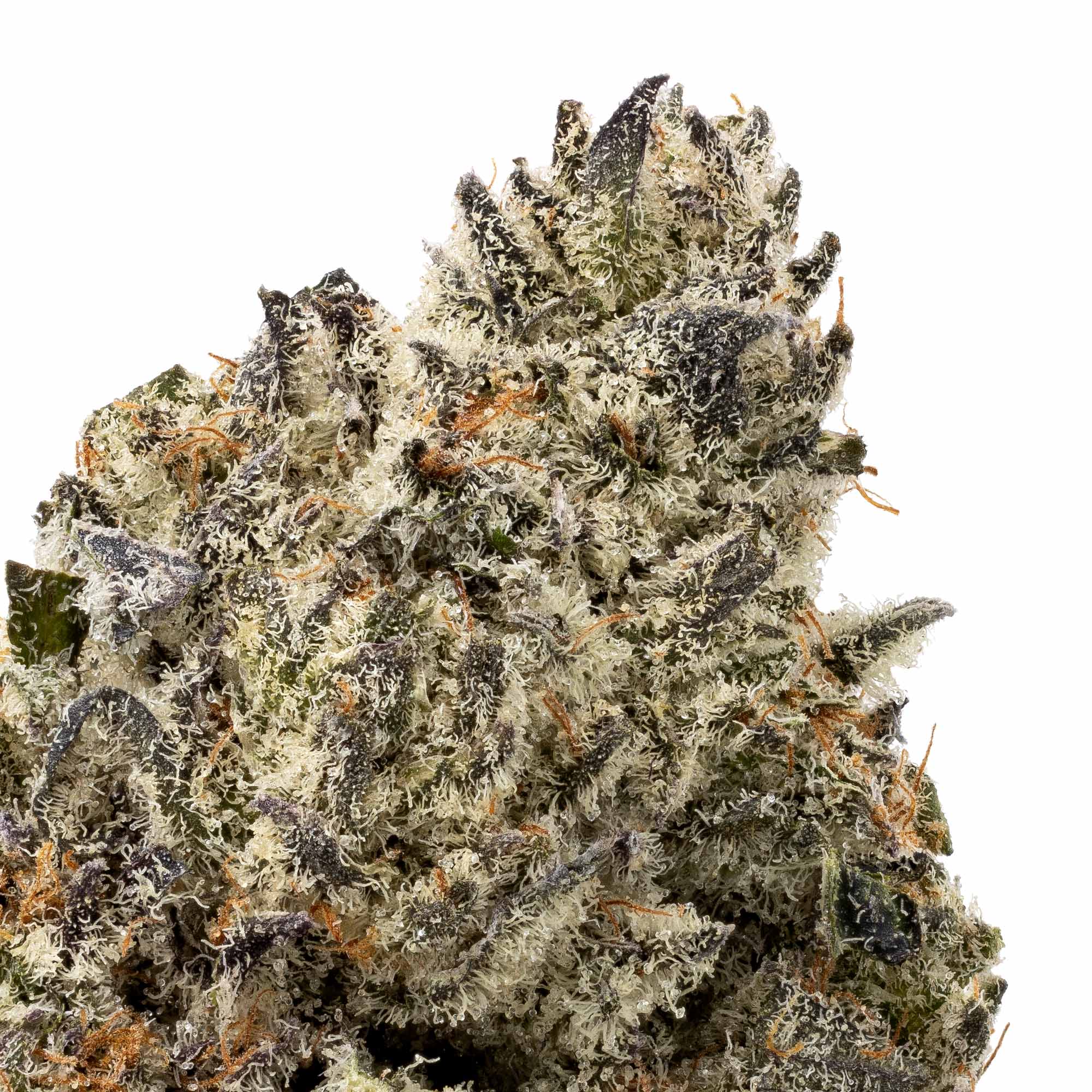 Flavor is a standout. Sweet, creamy tropical citrus with a pop of spicy orange, layered over a floral, slightly gassy aroma. The buds are compact and frosty, with olive-green tones, dark leaves, and a sparkling coat of crystal trichomes.